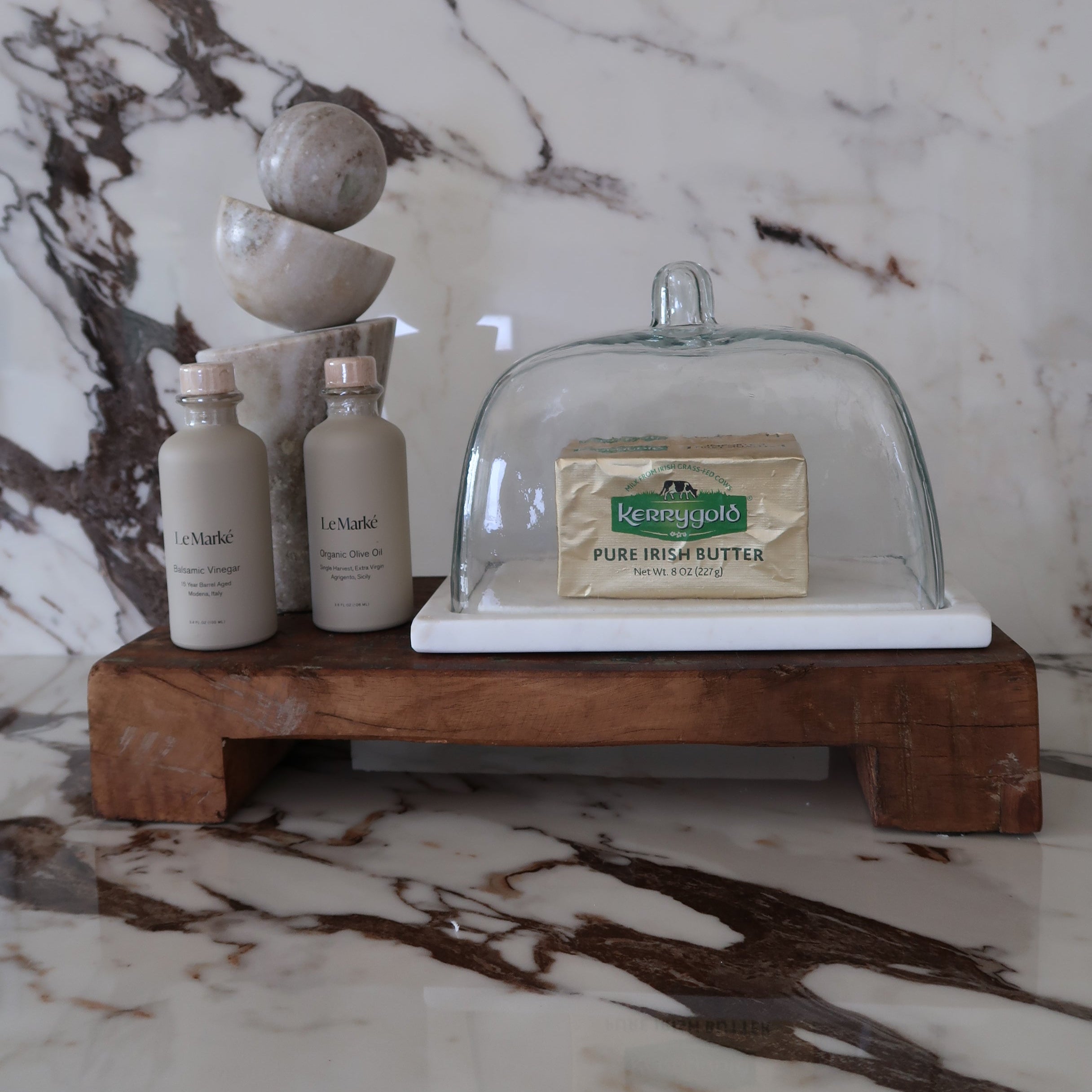 Decorative Wooden Pedestal, Glass Conche with White Marble Base, Decorative Marble Object, and Tavola Set with Olive Oil & Balsamic